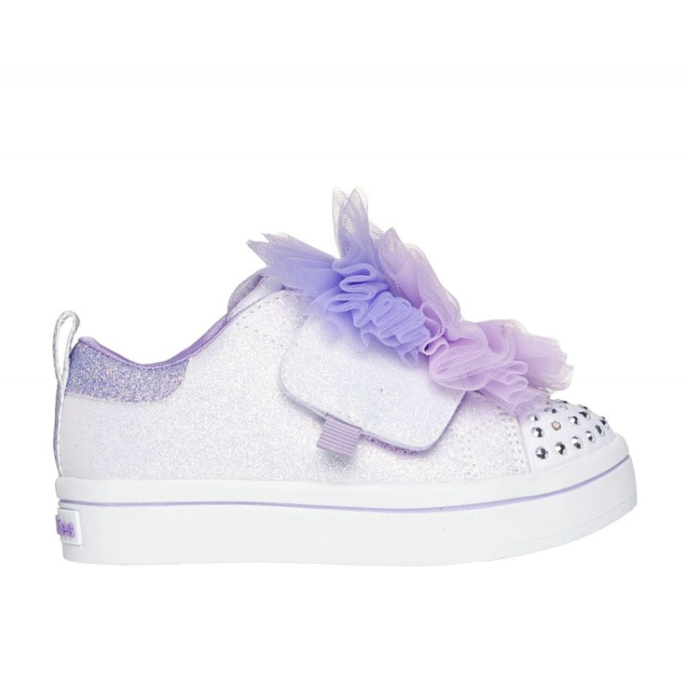 • Šis šviečiantis modelis pasižymi kristalais puošta nosimi, blizgančiu sintetiniu viršumi, adaptyviu užsegimu Skechers ir tiulio kaspino detale priekyje.