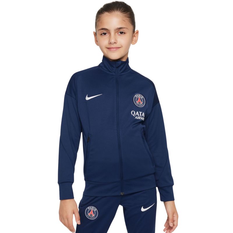 Nike PSG Dri-Fit Academy Pro Navy Blue FQ0063 411 vaikiškas sportinis kostiumas. Šis sportinis kostiumas yra funkcionalus bet kurio jauno gerbėjo sportinės aprangos papildymas. Jis dekoruotas „Paris Saint-Germain“ logotipu. „Dri-FIT“ technologija sugeria drėgmę. Megztinis turi užtrauktuką per visą ilgį ir užtrauktukais užsegamas kišenes. Sportinio kostiumo apačia turi elastinius rankogalius. Elastinis juosmuo reguliuojamas raišteliu. Medžiaga: 100 % poliesteris